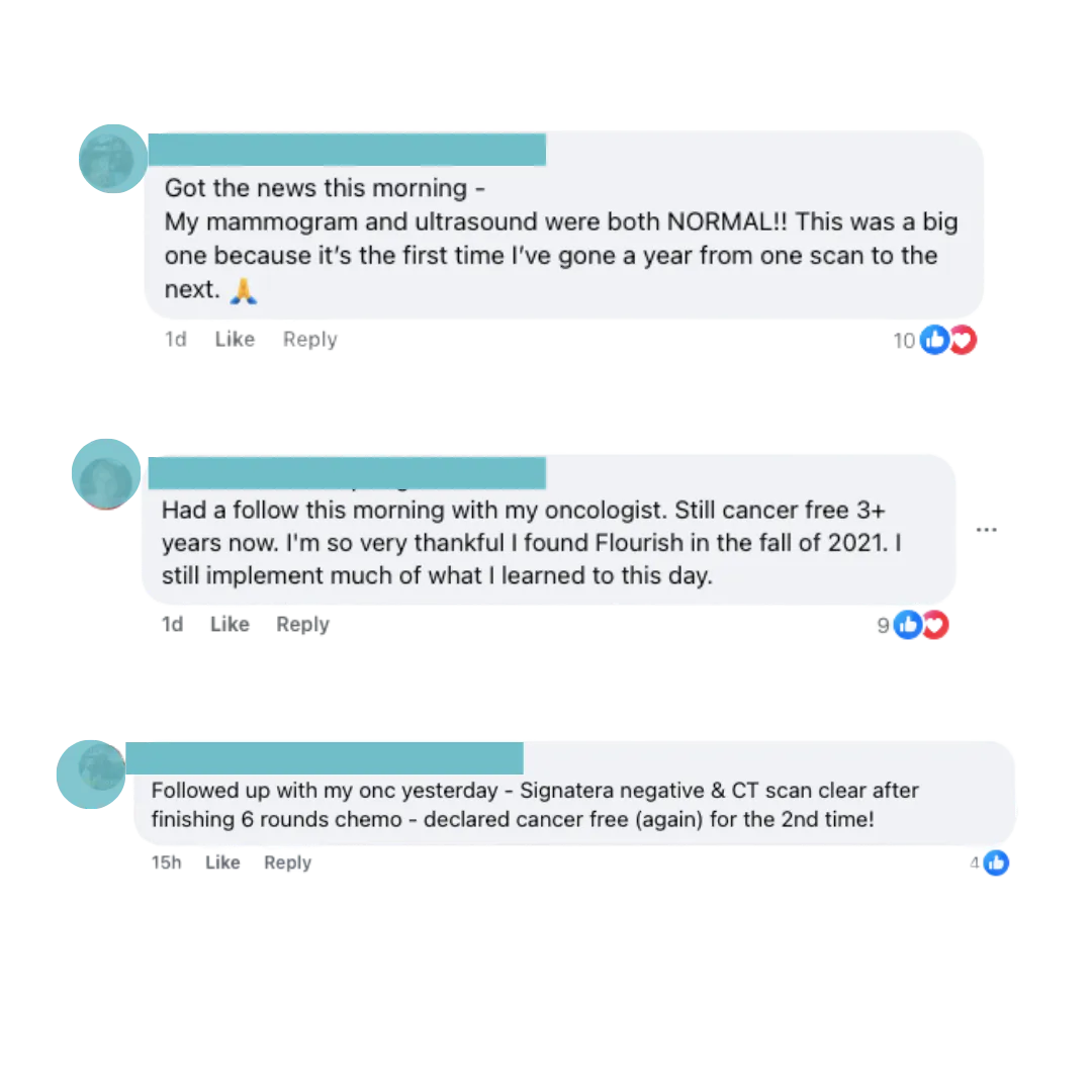 Flourish is more than just a program, it's like getting a new best friend. One who is knowledgeable and calm and supportive in all the areas of health: physical, mental and emotional. The Flourish Team went above and beyond my expectations in coaching me through this post-treatment period. Thanks so much!"